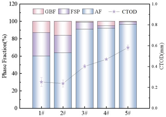 Figure 4 shows the metallographic micrographs of five kinds of weld structures; their corresponding critical CTOD values are 1# (0.222 mm), 2# (0.264 mm), 3# (0.390 mm), 4# (0.474 mm), and 5# (0.599 mm), respectively. It can be seen that the microstructure of the weld had mainly been composed of non-directionally arranged AF, thick large layers of FSP inserted into the protoaustenite crystals, and GBF growing along the protoaustenitic grain boundary. The statistical results of its proportion, obtained using ImageJ software, are shown in Figure 5. AF, as the microstructure with the greatest impact on the mechanical properties of weld metal, accounts for approximately 65–94.61%. GBF and FSP were harmful structures in weld metal, accounting for 0.59–26.1% and 3–27.1%, respectively.