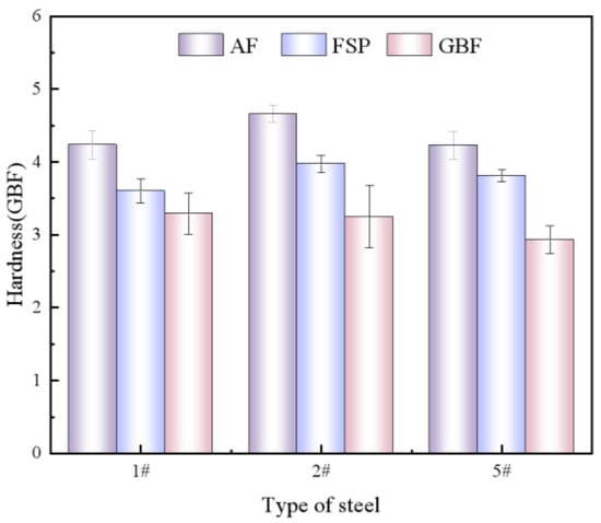 To compare the hardness of single-phase structures in AF, GBF, and FSP, nanoindentation tests were conducted on the microhardness of single-phase structures in the 5# weld with high AF content, the 2# weld with high GBF content, and the 1# weld with high FSP content. The experimental results are shown in Figure 7, and it can be observed that there is a significant difference in hardness between the three tissues. AF is the microstructure with the highest hardness in the weld seam, ranging from 4.23 to 4.66 GPa. GBF, as the soft phase in the weld seam, has a hardness value of 2.92–3.29 GPa, which is about 30% lower than the hardness of AF. The hardness of FSP ranges from 3.6 to 3.97 GPa between AF and GBF.