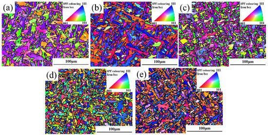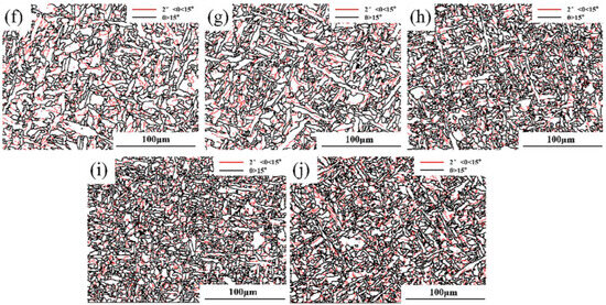 Because EBSD technology is extremely sensitive to grain internal stress and microstructural defects, this study aims to further investigate the influence of weld metal microstructure on fracture toughness. EBSD technology is used to finely characterize AF, GBF, FSP, and crack propagation paths in weld metal. Figure 8a–e show the inverse pole diagram (IPF) of AF in five kinds of welds, and the different colors of the scale of the triangle on the top right of the picture represent three different orientations. The IPF diagram shows that the crystal orientation of adjacent AF grains is different, the orientation difference between adjacent grains is large, and the overall orientation distribution is uniform. Figure 8f–j are the grain boundary diagrams of AF. If the orientation difference between adjacent grain boundaries is greater than 2° and less than 15°, it is set as a low-angle grain boundary (LABG) in red; if the orientation difference between adjacent grain boundaries is greater than 15°, it is set as a high-angle grain boundary (HAGB) in black. According to statistics, the grain boundary energy of AF is relatively high, which is basically a HAGB greater than 45°. Therefore, when cracks pass through AF, more crack propagation energy is consumed, which can significantly reduce the crack propagation rate [27].
