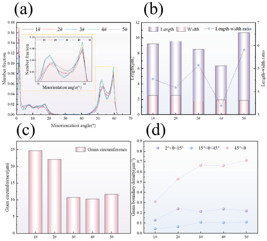 AF crystal information analysis in 1#–5# weld metal: (a) distribution diagram of orientation difference angle; (b) aspect ratio chart; (c) grain circumference map; (d) grain boundary density map.