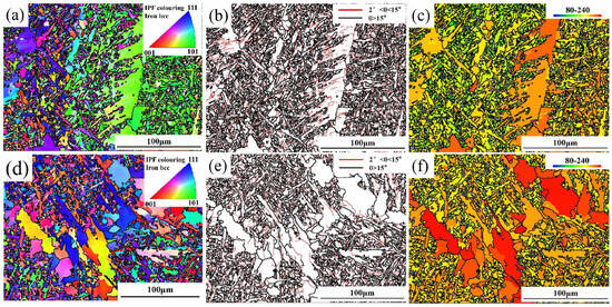 EBSD characterization of 1# and 5# weld metals: (a–c) IPF diagram, grain boundary diagram, and MBS diagram of 5# weld metals; (d–f) IPF diagram, grain boundary diagram, and MBS diagram of 1# weld metal.