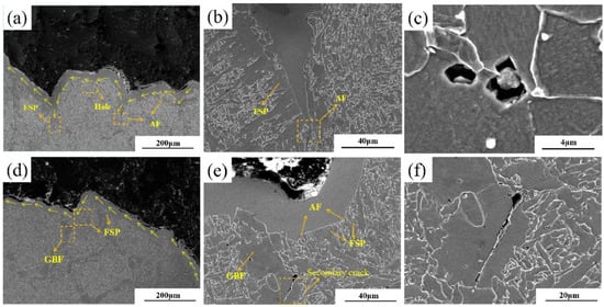 In order to clearly observe the influence of the microstructure of the weld on the crack growth path, the pattern was split in half along the direction perpendicular to the section, and the crack growth path was characterized. Figure 11a,d shows the crack growth paths in the brittle region of 5# and 1#, respectively. It can be seen that the crack propagation path of weld 1# is relatively straight, with fewer turning points; while the crack propagation path of weld 5# is more tortuous, with a longer total crack length. As shown in Figure 11b,e, it can be observed by magnifying the turning point that cracks expand in a straight line when passing FSP and GBF, which consumes less crack propagation energy, accelerates the crack propagation rate, and seriously damages the fracture toughness of weld metal. When the crack passes through AF, the crack has obvious deflection, and most of the deflection angle is greater than 90°. From Figure 11c, it can be observed that there are many micropores distributed in the area near the main crack. The formation of these micropores is due to the shedding phenomenon caused by the stress difference between the inclusion and the matrix. These micropores will become the nucleation sites of cracks, and AF has good plastic deformation ability, which inhibits the further expansion of micropores and reduces the risk of ductile fracture caused by micropore polymerization. This mechanism effectively enhances the crack stopping ability of the weld metal and then significantly improves the fracture toughness of the weld metal. As shown in Figure 11f, there are more secondary cracks in the matrix below the main crack of the 1# weld, and the secondary cracks mostly appear in GBF and FSP, which are linear transgranular fractures. The cracks stop at the grain boundary of AF, and the length is related to the size of the grain where they are located. When the secondary crack occurs in the AF, the total length is shorter and the deflection at the grain boundary is obvious.