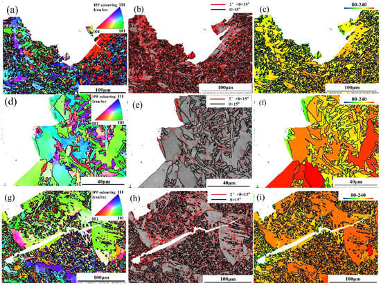 EBSD characterization of crack trend in the brittle fracture zone of 1# and 5#WM: (a–c) IPF diagram of 5# weld metal, grain boundary diagram of size and angle, and MBS diagram; (d–f) IPF diagram of 1# weld metal, the grain boundary diagram of size and angle, and the MBS diagram; (g–i) IPF diagram, the grain boundary diagram, and the MBS diagram of the secondary cracks in the 1# weld metal matrix.