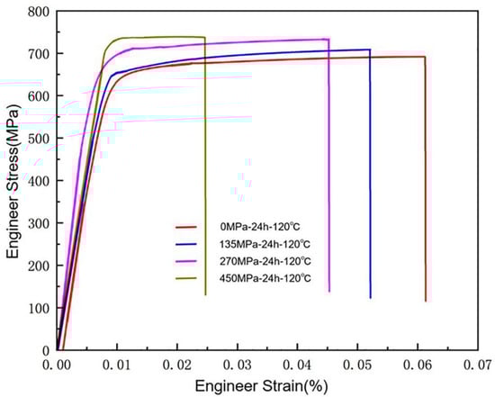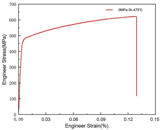 In this study, the sample was first a solution treatment at 475 °C for 3 h, after which it was formed into a tensile rod with a diameter of 5 mm. After the solid solution treatment, tensile tests were conducted on the sample using an Instron3382 universal tensile testing machine (Shenzhen, China). The yield strength (YS) and ultimate tensile strength (UTS) of the sample were measured to be 450 MPa and 624 MPa, respectively, with an elongation of 12.5%, as shown in Figure 2. In order to test the changes in the strength, toughness and corrosion properties of the sample after stress-aging and peak-aging treatments, a stress-aging time of 24 h was selected. Based on the yield strength tested above, three groups of stress levels were set: 0.3, 0.6 and , respectively. The final testing scheme is detailed in Table 2. Then, the experimental scheme was designed, and the creep stress testing machine of Central South University was used for stress aging. After stress aging, a tensile test, transmission electron microscope scanning and a corrosion test were carried out to test the mechanical properties, microstructure and corrosion resistance of the samples. The design of the tensile experiment, transmission electron microscope scanning and corrosion experiment is shown below.