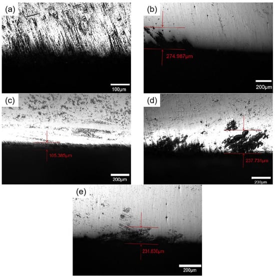 Intergranular corrosion of alloys after different aging treatments: (a) S0; (b) SF; (c) S135; (d) S270; (e) S450.
