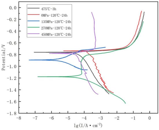 In this study, it was found that the corrosion resistance of the alloy exhibits a strengthening trend with the application of external stress. The alloy demonstrated optimal corrosion resistance when subjected to a stress level of 135 MPa. This improved corrosion resistance can be attributed to the fact that crystal lattice defects will appear in the stress-aging state, resulting in the decline of solid solubility. At the same time, the external stress also restricts the movement of vacancy–atomic clusters. At low stress levels, this effect is more significant, combined with the competitive relationship between precipitated phases. The corrosion resistance of the Al-Zn-Mg-Cu alloy is improved by decreasing the vacancy migration to the grain boundary and the number of solute atoms.