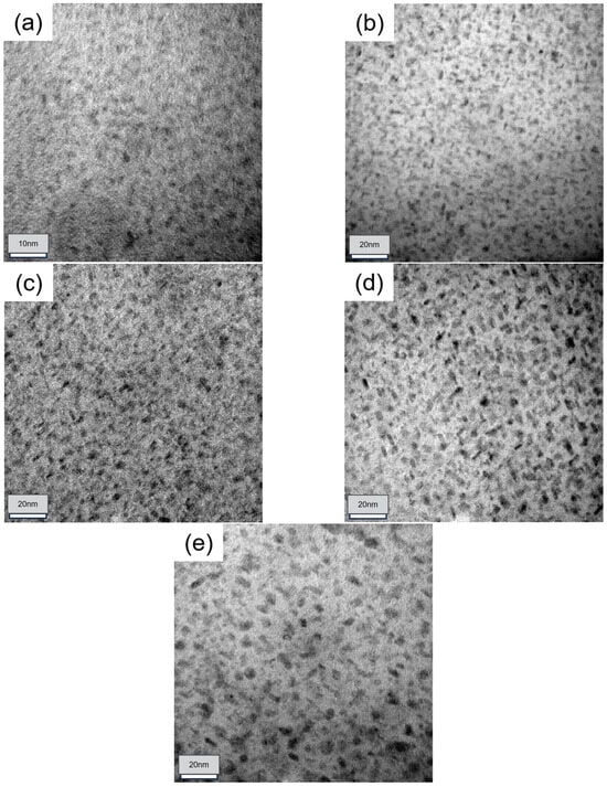 The changes of the mechanical properties and corrosion resistance of the samples under different aging treatments were investigated by analyzing their microstructural evolution, as summarized in Table 2. The microstructure of the sample after different aging treatments was compared and observed using TEM bright-field (BF) imaging along the <110>Al axis (Figure 7). BF images indicate that the morphological characteristics of microplastics (MPs) vary across different aging states. In particle size calculation, MPs of different shapes are approximated as spheres of equal diameter for convenience of statistics. The average sizes were measured using a Nano Measurer, and then the MP number was quantified using Image Pro+.