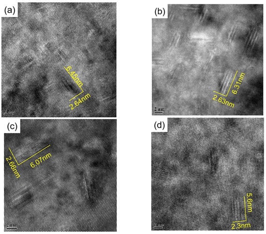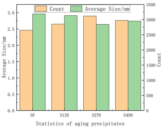 For the alloy treated with solid solution, as shown in Figure 7a, very few precipitates were observed, and minimal precipitation was seen at the grain boundaries, rendering the PFZ at the grain boundary negligible compared with other samples. After aging treatment under the SF condition, the quantity and density of the precipitated phase changed greatly, and the amount of these fine precipitated phases in the crystal is obviously increased. It can be observed from the TEM images that the density of the internal precipitated phases in the alloy samples after aging treatment with external stress is further increased, and the size of the grains is further reduced. As shown in Figure 8, the sizes of precipitated phases in samples SF, S135, S270 and S450 are 6.45 nm, 6.31 nm, 6.07 nm and 5.6 nm, respectively. This result is similar to the data measured in Figure 9. Moreover, the mechanical properties of the alloy are further improved after the applied stress, because the number of η’ phases increases and the size decreases, so more fine η’ phases can improve the mechanical properties of the alloy.