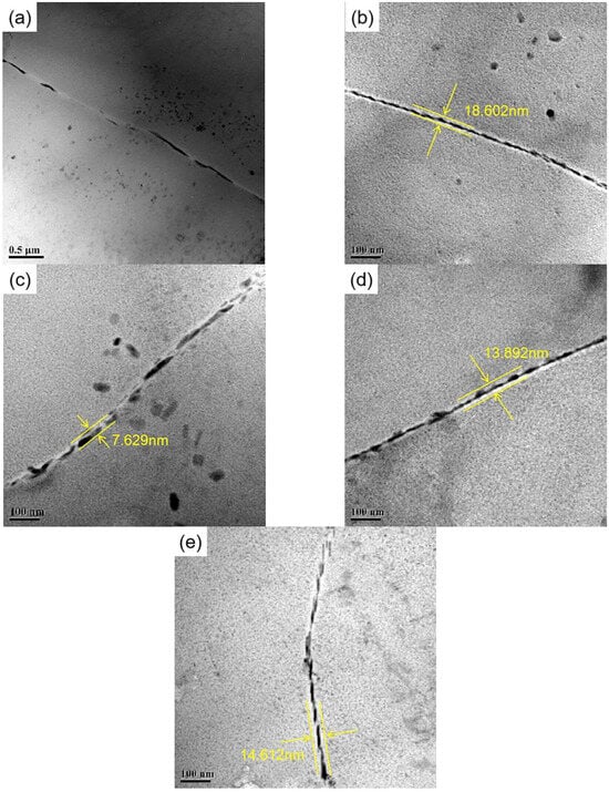 At the same time, the width of the precipitation-free zone (PFZ) observed here also changes greatly. After peak treatment, the precipitated phase is distributed continuously along the grain boundary. The width of the PFZ is approximately 18.6 nm, as shown in Figure 10b. After the applied stress, it can be observed that the grain boundary precipitates also grow and distribute discontinuously along the grain boundary. At the same time, it can be found that the coarsened GBP also grew and distributed discontinuously along the grain boundaries. Furthermore, the PFZ widths in alloys subjected to stress aging with S135 (Figure 10c), S270 (Figure 10d), and S450 (Figure 10e) were about 7.6 nm, 13.9 nm and 14.6 nm, respectively. Applying stress below a specific threshold can enhance GBP growth and widen the PFZ. In a certain range, the width of the PFZ is negatively correlated with corrosion resistance.