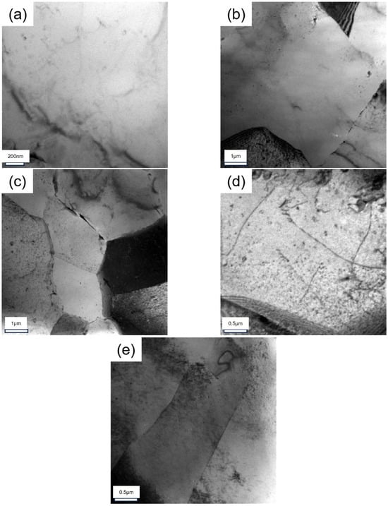 TEM bright field image in alloy: (a) S0; (b) SF; (c) S135; (d) S270; (e) S450.