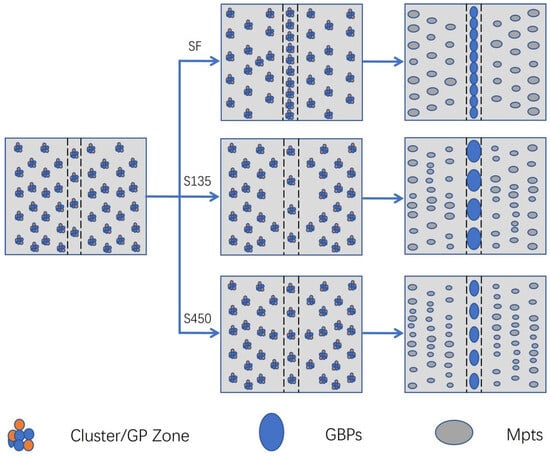 As shown in Figure 10, in the S0, there is little grain boundary precipitation, there is a large distance between precipitates, and the PFZ width is extremely narrow. After peak-aging treatment, a large number of GBPs appear and are continuously distributed. However, during the aging process of S135, S270 and S450, the precipitates appear to have a discontinuous distribution. According to the depletion mechanism of vacancy and solute atoms [,], vacancy and solute atoms will migrate to the grain boundary and be consumed under the action of applied stress. When the applied stress is 135 MPa, lattice defects will appear under low external stress, resulting in a decline in solid solubility, which further inhibits the dissolution of clusters/GP zones in the sample and promotes the nucleation of new precipitates. Concurrently, the applied stress will impede the diffusion of vacancies, thus reducing the diffusion of solute atoms to the grain boundary. The grain boundary precipitation exhibits an intermittent distribution. As the applied stress increases to 270 MPa, a significant number of dislocations are introduced into the matrix. The presence of dislocations will dissolve the vacancy, thus reducing the precipitation site in the crystal. Meanwhile, the increase in applied stress also reduces the diffusion inhibition of the vacancy, so enough solute atoms migrate to the grain boundary, resulting in a relatively continuous precipitates at the grain boundary. When the applied stress increases to 450 MPa, more dislocation entangling is introduced, which reduces the degree of inhibition exerted by stress on vacancy diffusion. This results in a greater migration of vacancy and solute atoms to the grain boundary. However, the total amount of solute atoms is fixed, and more nucleation sites but not enough solute atoms lead to the reappearance of an intermittent distribution of precipitated phase at the grain boundary. The considerable impact of stress aging and peak aging on the grain boundary characteristics of the sample is shown in Figure 11.