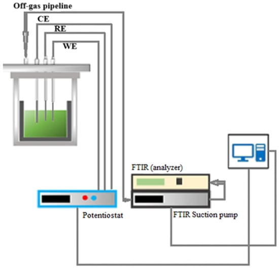 A three-electrode configuration was used in the electrochemical experiments, with the electrodes and thermocouple positioned in the molten fluoride in a custom-built stainless-steel cell. Once the electrolyte was melted, the electrodes were immersed in the melt and connected to an IviumStat potentiostat (5 A/10 V; Ivium Technologies, Eindhoven, The Netherlands), which was used to run the electrochemical measurements and MSE. For the electrochemical measurements, the working electrode (WE) was a glassy carbon rod with a diameter of 4 mm (GC, >99.99% HTW SIGRADUR® G). Molybdenum (Mo) wire with a 2 mm diameter (EWG 99.95%) was used as a counter electrode (CE) and the quasi-reference electrode (RE) was tungsten wire (W, EWG 99.9%), 2 mm diameter. As for electrolysis, the working electrode was Mo, the counter electrode was glassy carbon, and W was used as the reference electrode. In all measurements, the electrodes (WE, CE, and RE) were 1 cm immersed in the electrolyte. All potentials in this paper are reported in reference to the tungsten quasi-reference electrode. The quasi-reference W electrode used in the electrolyte containing NdF3 + PrF3 + LiF and the corresponding REO or MRDO provided a reliable potential. Before each measurement, the electrodes were polished thoroughly using SiC paper and then cleaned [14]. Electrolysis experiments were carried out in constant potentiostatic mode for up to 5 h, during which constant off-gas monitoring was maintained. Figure 1 shows a schematic presentation of the experimental setup. A Fourier transformation infrared spectrometer (FTIR, Gasmet DX4000 Ansyco, Karlsruhe, Germany) continuously measured evolved anodic gases in situ. A Gasmet DX4000 FTIR analyzer was used, consisting of an FTIR unit, a gas pump, an oxygen pump, and a control unit. Argon was used at a flow rate of 1.5 L/min, regulated by a mass flow controller, and the FTIR spectra were recorded at a resolution of 8 cm−1 with 10 scans per measurement. Concentrations in ppm were determined using Gasmet’s Calcmet software (DX4040), which applies the Beer–Lambert law to match measured spectra with a precalibrated reference library. Before each experimental run, the baseline spectrum was analyzed using nitrogen to validate the optical path, ensure instrument stability, and correct for potential drift. The gas cell was maintained at 180 °C to prevent condensation, and periodic calibration checks ensured measurement accuracy. Both datasets, from the gas measurement (FTIR) and the electrochemical measurement (Iviumsoft 4.1178), were matched manually. The starting time of each experiment corresponding to the starting points of FTIR measurements were coordinated to create the voltammograms.