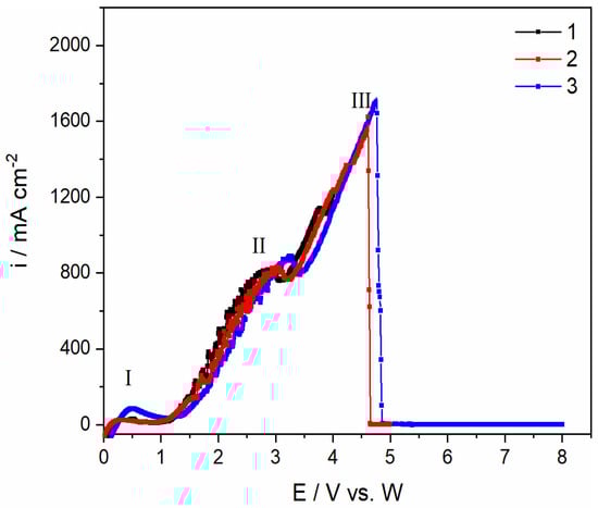 The linear sweep voltammograms recorded on a glassy carbon electrode in the NdF3 + PrF3 + LiF +2 wt.% Pr6O11 + 2 wt.%Nd2O3 electrolyte at final potentials: (1) 4.00 V; (2) 5.00 V; and (3) 8.00 V vs. W; T = 1323 K.