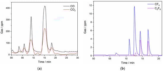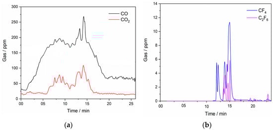 Off-gases recorded in situ with an FTIR spectrometer during LSV scan (anodic end potential 8.00 V, Figure 2) on GC electrode in NdF3 + PrF3 + LiF +2 wt.% Pr6O11 + 2 wt.% Nd2O3 electrolyte; T = 1323 K; (a) CO and CO2…(b) CF4 and C2F6 off-gases measured concentrations.