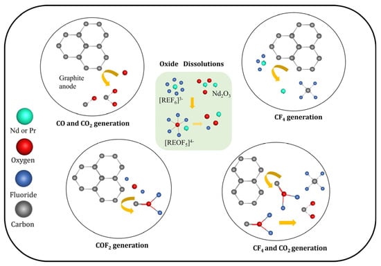 - The dissolution of REO in fluoride-based melts leads to the fluorides such as [REFx]y− and oxyfluoride [REOFx]y− complexes involved in CO2/CO and CF4/C2F6 formation on the anode. A schematic presentation that incorporates the complex formation and its subsequent reactions on the GC anode surface was developed.