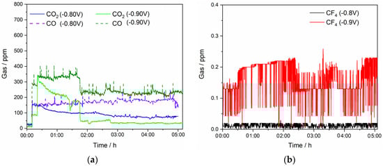 The anode gas products are mainly composed of CO and CO2, which is in accordance with previous reports [19,21,22,24,30]. There is an obvious difference in the CO and CO2 gas concentrations emitted during the electrolysis. The average CO concentration was approximately 200 ppm, while CO2 concentration was approximately 100 ppm for a deposition potential of −0.80 V vs. W, whereas for a deposition potential of −0.90 V vs. W, CO content was on average 250 ppm and CO2 concentration well below 100 ppm. After a certain deposition time, the quantity of CO2 became substantially smaller, which could be attributed to the partial passivation of the anode active sites with oxygen-containing ions. The continuous gas analysis shows that CF4 was detected in negligible concentrations. CF4 was detected periodically, and, when recorded, the highest concentration was around 0.2 ppm, while C2F6 is not detected. C2F6 is always formed after CF4 but in rather small amounts, just above or below the detection limit. Therefore, these data are not reliable and are not presented in Figure 5 or in the discussion. The potential of CO formation is 1.297 V, which is lower when compared to the one of CO2 (1.454 V), which is why it is probably formed first, resulting in a higher value in off-gas composition [31]. In addition, CO2 cannot react with the GC itself, but gas might penetrate into cracks and pores in the anode and the Boudouard reaction takes place there, Equation (16) [32]. Consequently, the concentration of CO in anodic gases is in agreement with the obtained results.