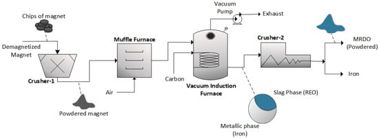 In the future, the development of sustainable and economically viable recycling processes that enable the recovery of REEs reinserted into the supply chain will become an important source of the overall RE supply. We have proposed a combination of a pyrometallurgical process [34] and subsequent MSE from fluoride-based molten salts [6]. Figure 6 summarizes rare earth oxide production, referred to as magnet recycling derived oxides (MRDOs), produced directly from spent NdFeB magnets. The flow of the process is briefly depicted in Figure 6. The methods developed by [34,35] were adopted in this research to produce high concentrations of rare earth oxides. The process started with grinding the magnet into powder from its initial shape (small chips). The powdered magnet was then fed to a muffle furnace, where oxidation occurred. A vacuum induction furnace under an inert vacuum atmosphere was then utilized to process the oxidized magnet. Stoichiometrically calculated carbon powder was added to the magnet to perform carbothermic reduction. The addition of carbon was also to avoid the consumption of the graphite crucible used to contain the oxidized magnet during the process. Separation between the metallic phase (iron-rich) and slag phase (rare earth oxide-rich) was observed during the experiment, as shown in Figure 6. Mechanical separation was then carried out with a crusher at the end of the process flow to obtain the rare earth slag phase (MRDO) in the form of powder, which was easily separated from the metallic iron chunks. According to ICP-OES results, MRDO contains roughly 33 wt.% Nd and 10 wt.% Pr in different NdFeB-based rare earth oxides such as Dy2O3, NdO2, Nd2O2, Pr5O9, Nd2O3, Pr2O3, DyFeO3, and PrNdO2 [6].