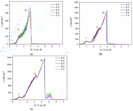 At 3 wt.% MRDO added to the electrolyte, Figure 7b, in the voltammograms, the peak current density (II) at potential ≈ 3.00 V vs. W reaches a value of around 650 mA cm−2. The current density then drops to a lower level, indicating a partial anodic effect, until the value rises again. Finally, the peak current density (III) increases and reaches 1300 mA cm−2, at an anodic peak potential around 3.50 V. The observed maximum current density at a potential around 3.50 V vs. W is followed by a sudden current fall, manifesting the full anodic effect; this time shifts slightly positively compared to the value in the LSV in Figure 7a. With 4 wt.% of MRDO in the fluoride-based melt, the maximum oxidation current density (III) at an anodic peak potential around 4.50 V, before dropping to 0, was about 2000 mA cm−2, which is a characteristic of the full anodic effect, as shown in Figure 7c.