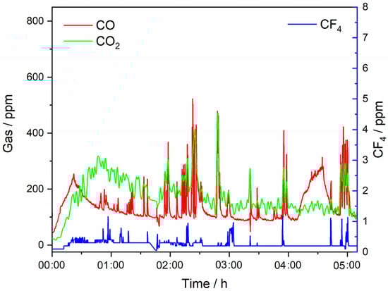 To quantify potential environmental impacts concerning greenhouse gas emission from the fluoride-based MSE process, we investigated the off-gas composition during REE extraction from NdF3 + PrF3 + LiF + 4 wt.% MRDO, Figure 9. Our previous experiments have shown that REEs can be successfully extracted by continuous electrolysis under certain process conditions [6]. This is only one average value of a minimum of three experiments involving laboratory measurements; therefore, the off-gas concentration values should be considered more for the qualitative description of the systems and processes than for quantification. However, for a sustainable process for RE electrolysis and RE metal production, it is still important to estimate emission factors that should at least minimize CO2 and PFC emissions.