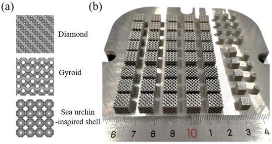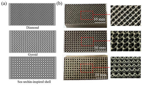 (a) Models of diamond, gyroid, and sea urchin-inspired shell structures; (b) SLM-fabricated structures using Fe80-xMnxCo10Cr10 HEAs.