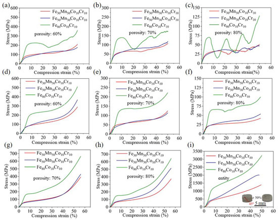 Stress–strain curves of Fe80-xMnxCo10Cr10HEA structures: (a–c) diamond; (d–f) gyroid; (g,h) sea urchin-inspired shell structure; (i) cylindrical bulk.