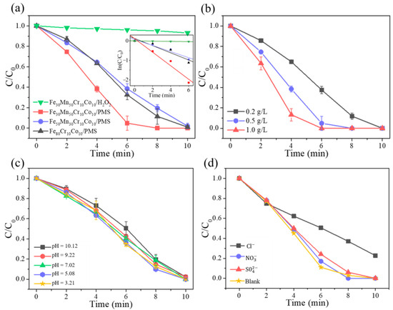 The catalytic degradation effect of the Fe30Mn50Co10Cr10/PMS system on ARG was investigated under different solution pH levels, as depicted in Figure 7c. It can be observed that the trend of ARG degradation efficiency remained consistent across various initial solution pH values. Compared to alkaline conditions, a slightly higher catalytic degradation efficiency was achieved when the initial solution was acidic for the Fe30Mn50Co10Cr10/PMS system. Within 6 min, at a pH of 3.21, the catalytic degradation rate of ARG reached 65.7%, while it decreased to 49.5% at a pH of 10.12. After 10 min of catalytic degradation, ARG exhibited a degradation rate of 97.6% across different pH levels, indicating that the Fe30Mn50Co10Cr10/PMS system effectively degraded simulated pollutants over a wide range of pH (3.21–10.12). However, it should be noted that in real pollutant wastewater samples, the presence of coexisting ions such as , , and may influence the degradation performance of the Fe30Mn50Co10Cr10/PMS system. The degradation effect of different anions in the Fe30Mn50Co10Cr10/PMS system is illustrated in Figure 7d. In order to conduct the catalytic degradation test, solutions containing 1 mg/L NaCl, NaNO3, and Na2SO4 were added to the initial solution of the Fe30Mn50Co10Cr10/PMS system. As depicted in the figure, and did not exert any influence on the degradation performance of ARG pollutants in the Fe30Mn50Co10Cr10/PMS system, with a removal rate reaching 100% within 10 min. Conversely, significantly inhibited the degradation performance of the Fe30Mn50Co10Cr10/PMS system, resulting in a decrease of ARG degradation rate to 77.4% within 10 min. This can be attributed to reacting with HO· and in solution to form Cl·, both Cl· and exhibited high reaction rates and readily formed , which possessed relatively weak oxidation ability. Consequently, both the degradation rate and efficiency of ARG in this system were reduced. Therefore, an inhibition effect was observed when co-existed.