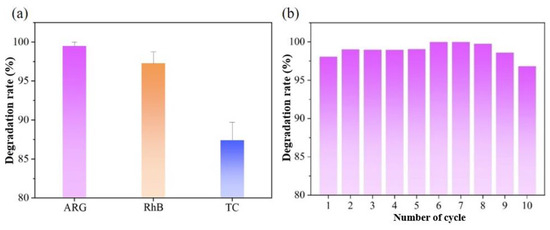(a) Universality of catalyst for degradation of different organic pollutants; (b) cycle stability of catalyst for degradation of ARG.