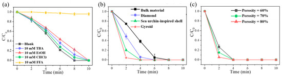 (a) Effects of different trapping agents on ARG degradation, and C/C0 indicates the ARG degradation rate; (b) different structural types of Fe30Mn50Co10Cr10; (c) different porosity of Fe30Mn50Co10Cr10 gyroid structure.