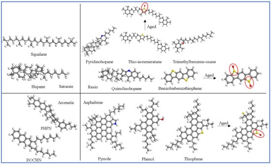 The molecular structure of asphalt and the proportion of components were changed after aging. So, the aged base asphalt model was constructed by adjusting some structures and changing the proportion of fractions [29]. The molecular structure of the original and aged base asphalt is shown in Figure 1 (marked sections indicate molecules that have changed with aging). The molecular composition is in Table 1. The original and aged base asphalt models were constructed based on the number of molecules in Table 1.