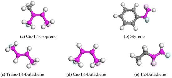The CR used in CRMA is mainly derived from waste tires. However, the selection of molecular models for CR is not uniform in the current studies. Significant differences existed in the type, proportion, and polymerization degree of the constituent molecules [21,30,31,32,33,34,35,36,37]. Natural rubber (NR) and styrene butadiene rubber (SBR) were selected as the main components to construct a more accurate CR model. The mass ratio of NR to SBR is 7:3 [30,31]. NR is a homopolymer, and the synthetic monomer is cis-1,4-isoprene. SBR is a random copolymer, and the synthesis monomers are styrene and butadiene. Butadiene contains different structures, including trans-1,4-butadiene, cis-1,4-butadiene, 1,2-butadiene, etc. The molecular structures of five synthetic monomers are shown in Figure 2. The repeat unit content of each structure of SBR is shown in Table 2.