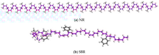 The dosage of CR was 20 wt% in CRMA. Based on the mass ratio of NR to SBR, the molecular numbers of the two rubbers can be calculated. The single chain of the rubber model could also be constructed (as shown in Figure 3).