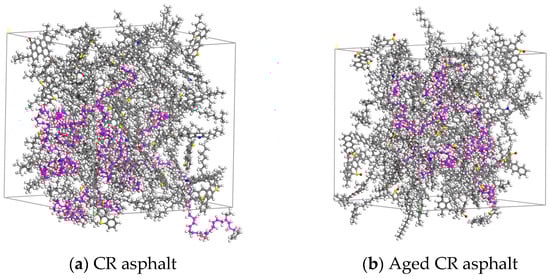 The CR (the purple part of the figure), original, or aged base asphalt models were scaled to construct CRMA models. The original and aged CRMA models are shown in Figure 4.