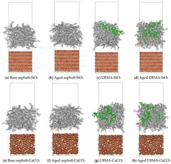 The Build Layer function was used to build the asphalt–aggregate interface models with optimized asphalt and aggregate models. A vacuum layer of 30 Å was added above to avoid the influence of periodic boundary effects in the Z direction. The lower part of the aggregate model was fixed to simulate the actual situation better. The interface model is shown in Figure 5.