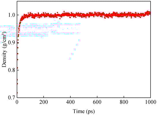 The density of the original base asphalt model was obtained after the NPT system was subjected to dynamic equilibrium at 298 K for 1000 ps. The mean density of the last 100 ps was taken as the representative density of the model. The density of the base asphalt model was calculated to be 1.003 g/cm3, as shown in Figure 6. The measured density of base asphalt generally ranges from 1.01 to 1.04 g/cm3 [38]. This indicated that the model construction and parameterization were reasonable for subsequent MD analysis [39].
