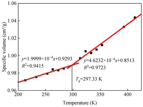 The results of specific volume calculations for the base asphalt model at different temperatures are shown in Figure 7. A further analysis of the data in Figure 7 yields a base asphalt model glass transition temperature of 297.33 K, which agrees with the simulation results in the literature (278.66 K) [40].