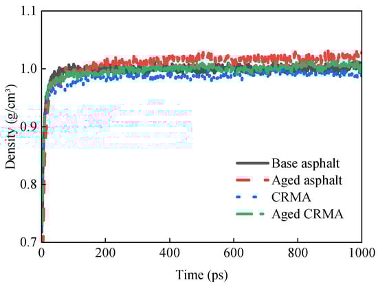 The mean density of the last 100 ps was selected to ensure the results were more representative. The density size relationship was calculated as aged base asphalt (1.021 g/cm3) > aged CRMA (1.006 g/cm3) > original base asphalt (1.003 g/cm3) > CRMA (0.990 g/cm3). Both the base asphalt and CRMA had higher densities after aging. This was due to the transformation of the asphalt fractions as the asphalt aged. A slight increase in the asphaltene content and a slight decrease in the aromatic, saturate, and resin content increased the density of the aged asphalt [42]. This resulted in a shift in the overall molecular weight distribution, forming a denser molecular structure and increasing the density of the asphalt. In addition, the elastic properties of rubber powder as a modifier may make the density of unaged CRMA relatively low. Mixing CR would increase the complexity of the system. However, it has an inhibitory effect on the movement of asphalt molecules, thus reducing the overall density. The aged CRMA model was constructed without considering the aging of CR. Therefore, density changes are mainly caused by asphalt aging. This results in the density of the aged CRMA being greater than that of the CRMA.