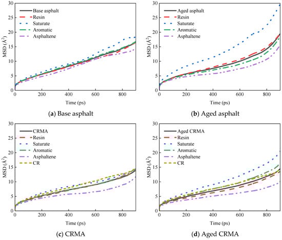 The optimized equilibrium state model was selected to analyze the MSD of each asphalt fraction. The sharp increase in MSD after 900 ps is due to the accumulation of computational errors, which can be eliminated from the analysis [44]. To better observe the MSD curve, the data from 0–900 ps were taken for plotting. The curves obtained for the MSD of asphalt and each fraction with simulation time are shown in Figure 9.