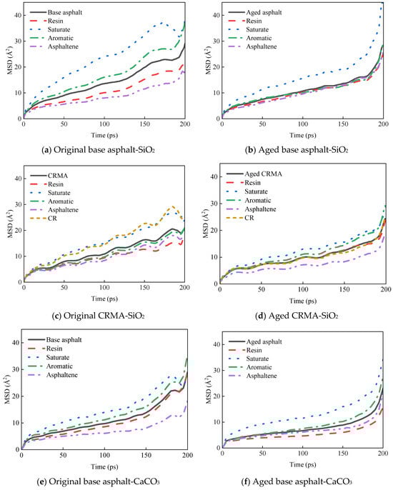 The MSD curves of each asphalt fraction on the aggregate surface are shown in Figure 11.