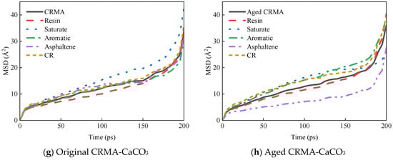 - The addition of CR reduced the motion of asphalt molecules. The diffusion coefficient of CRMA decreased by about 31% compared to base asphalt, and the diffusion coefficients of the fractions of CRMA were also lower than those of base asphalt. Because the CR molecules were mixed with the fractions of the asphalt, the intermolecular interactions in the system inhibited the incorporation of CR, resulting in the slow molecular movement of CRMA. Therefore, CR would inhibit the movement of asphalt fractions and, to a certain extent, could improve the stability of CRMA. However, it was shown that there is a correlation between the asphalt diffusion coefficient and its self-healing properties. Smaller diffusion coefficients would weaken the self-healing performance of asphalt mixtures for microcracks [19].