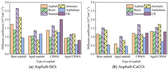 - The diffusion coefficient of the base asphalt decreased by about 10% after aging. However, the diffusion coefficient of CRMA did not change much. Because the diffusion coefficient of asphalt fractions affected their rheological properties [36], the rheological properties of CRMA were more stable, and the aging resistance was better than that of base asphalt.