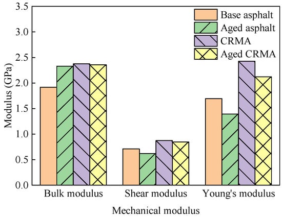 - Compared with base asphalt, CRMA increased each mechanical modulus. This included an increase in the bulk modulus of about 24%, shear modulus of about 23%, and Young’s modulus of about 43%. This indicated that CR improved the mechanical properties of asphalt and, through interaction with asphalt fractions, inhibited the movement of asphalt fractions.