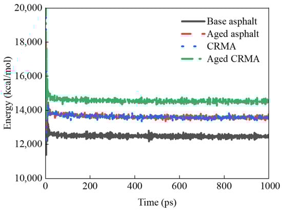 The energy change curves during the dynamic equilibrium of NPT system synthesis at 298 K for different kinds of asphalt models are shown in Figure 14.