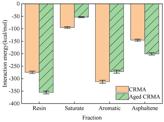 - In CRMA, the absolute value of the interaction energy between CR and each fraction was calculated as aromatic > resin > asphaltene > saturate. Considering that the content of the four fractions in the asphalt was not uniform, the interaction energy was divided by the mass percentage of the four fractions (Table 1) to make the simulation results more instructive. The magnitude relationship of the normalized fitting results was obtained as aromatic (−976.98 kcal/mol) > saturate (−853.38 kcal/mol) > asphaltene (−840.98 kcal/mol) > resin (−694.42 kcal/mol). The interaction energy of light fractions such as saturate and aromatic with CR was stronger, indicating that CR will physically adsorb with light fractions.