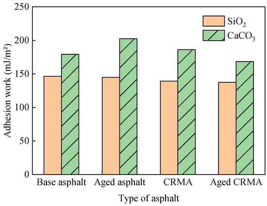 - After adding CR, the asphalt–SiO2 interfacial adhesion work decreased by 5.2%, and the asphalt–CaCO3 interfacial adhesion work did not change much. This indicated that adding CR reduced the adhesion properties at the asphalt–aggregate interface. It should be emphasized that this conclusion presupposes that the mass of base asphalt in CRMA was equal to the modeled mass of base asphalt in the asphalt–aggregate adhesion model. This also indirectly verified that the optimal oil/stone ratio of CRMA mixes was larger than that of base asphalt mixes when designing CRMA mix ratios [48].