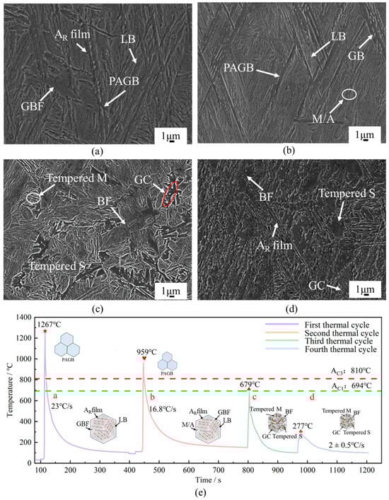 The evolution process of the microstructure of the HAZ with different thermal cycling conditions: (a) one thermal cycle, (b) two thermal cycles, (c) three thermal cycles, (d) four thermal cycles, (e) reheating cycle curves.