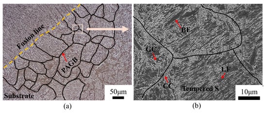 Components manufactured through forging additive hybrid manufacturing could be discernibly segmented into three distinct regions: the deposited zone, the HAZ, and the forged substrate zone [,,]. Typically, the HAZ exhibited heightened sensitivity to rapid fluctuations in heat accumulation, leading to notable variations in its microstructure under the influence of multiple non-equilibrium rapid solidification processes []. In conventional welding processes, the HAZ was divided into the coarse-grained heat-affected zone (CGHAZ), the fine-grained heat-affected zone (FGHAZ), and the inter-critically heated heat-affected zone (ICHAZ) based on distinct thermal histories [,,]. For instance, Ming et al. [] prepared a dissimilar metal weld of SA508-52-316L using narrow gap gas tungsten arc welding. The results showed that starting from the weld center, the microstructure of the SA508 HAZ was sequential as follows: coarse martensite → fine martensite + fine bainite → bainite + a small amount of fine martensite → bainite (tempered region).