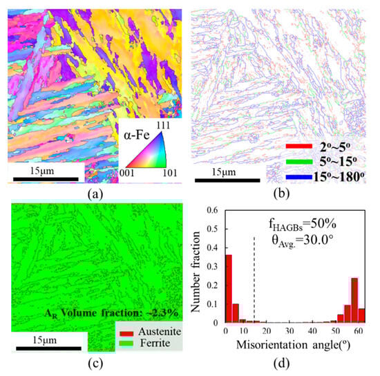 The crystallographic information of the HAZ of the sample after undergoing four thermal cycles is shown in Figure 4. The microstructure exhibited a relatively clear <001>α texture parallel to the Z-axis (Figure 4a). In fact, the various α-Fe variants present at room temperature originated from the precipitation of undercooled austenite [,]. Gan et al. [] found that the orientation relationship between BF and the PAGs adhered to the classical K-S relationship. LBs nucleated and grew in the same direction and the same grain boundary (GB), exhibiting similar orientations. The lath bundles act as the actual controlling unit, and large misorientation angles were formed within the LBs []. Figure 4b,d showed that HAGBs were approximately 50.9%, with average misorientation angles θAvg of 30.0°. The phase map indicated that the AR within the HAZ was situated within the bainite/ferrite lath boundaries, and the volume fraction of AR in the HAZ was as high as 2.9% (Figure 4c). This could be attributed to the diffusion of carbon elements under the effect of non-equilibrium heat, which destroys the stability of austenite.
