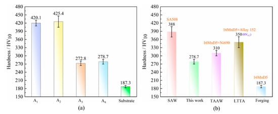 As described above, the microstructure has been fully austenitized during the initial two thermal cycles, and the identical microstructures were formed as a result. However, the amount of hard bainite was formed due to the rapid normalizing of the second thermal cycle. The average microhardness of the HAZ after the second thermal cycle was higher than that obtained after the first thermal cycle, as shown in Figure 5a, labeled A1 and A2. After the third thermal cycle, the high-temperature tempering caused a large amount of hard bainite to transform into PF. Concurrently, the GC precipitated at the ferrite lath interfaces. The average microhardness exhibited a notable decrease, dropping to approximately 272.8 HV10 (Figure 5a, labeled A3), with a maximum of 285 HV10. However, compared to the third thermal cycle, the average microhardness increased by approximately 10 HV10 after the fourth thermal cycle. It stabilized at around 278.7 HV10, with a peak value of 298 HV10, as shown in Figure 5a, labeled A4. That was due to the solid solution strengthening, which resulted in a superior average microhardness compared to that achieved through high-temperature tempering. Additionally, Figure 5b presents a comparative assessment of the microhardness measurements of the HAZ of 16MnD5 steel, considering samples subjected to SAW [], surfacing welding [], thermal aging [], and the present investigation. It was evident that the present work exhibited a relatively lower average hardness, indicating that the forging-submerged arc additive hybrid manufacturing effectively enhanced the microstructural homogenization within the HAZ.