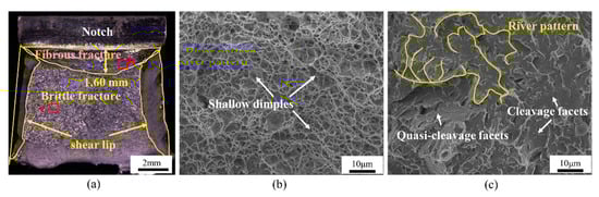 The impact absorption energy of the HAZ after undergoing four thermal cycles was 96.7 ± 16.86 J, and the samples were positioned as shown in Figure 1b. In addition, the impact fracture was found to consist of shear lips, fibrous zones, and radial zones (Figure 6a). The width of the fiber zone reached approximately 1.60 mm, and the fracture surface was densely populated with numerous small, deep dimples (Figure 6b). Dimples were microscopic voids produced during the plastic deformation of the impact sample in micro-regions. The larger the number and the smaller the size of dimples, the higher the energy absorbed during deformation. In the low-temperature Charpy impact test, the presence of dimples effectively enhanced the energy required for crack propagation. The radial zone was mainly composed of cleavage planes and quasi-cleavage planes (Figure 6c).