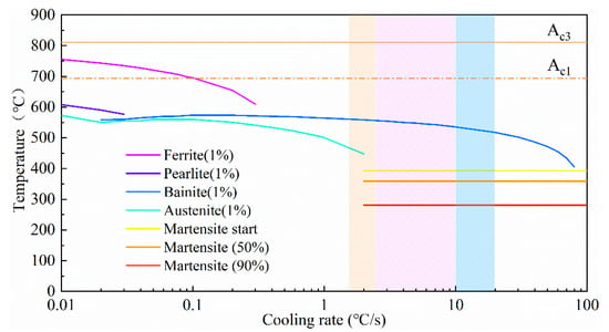 The CCT curve in Figure 7 indicated that, within the cooling range of 10–100 °C/s, the material system selected in this paper underwent a solid phase transition from the PAGs directly into bainite. According to the above, after the first two thermal cycles, bainite bundles distributed in different directions were formed inside the PAGs. This was because, in the early stage of the phase transformation, primary LBs nucleated at the PAGBs and grew into the grain interior. As the transformation progressed, subsequent bainite nucleated on the surface of the already formed bainite []. It is noteworthy that throughout the solid-state phase transformation process, a specific Kurdjumov–Sachs (K-S) orientation relationship was observed between austenite and bainite. As a result, under the impact of primary nucleation and surface-stimulated nucleation of bainite, various directions of bainite bundles, adjacent to each other, gradually formed within the PAGs. Furthermore, after the second treatment, the normalizing thermal effect on the bainite bundles initially led to an increase in the proportion of lath bainite in the microstructure. Additionally, due to the weakened heat dissipation conditions, the growth of lath structures resulted in the coarsening of bainite bundles. During the third thermal cycle, with the peak temperature falling within the high-temperature tempering range, partial bainitic ferrite underwent recovery and recrystallization, ultimately forming PF.